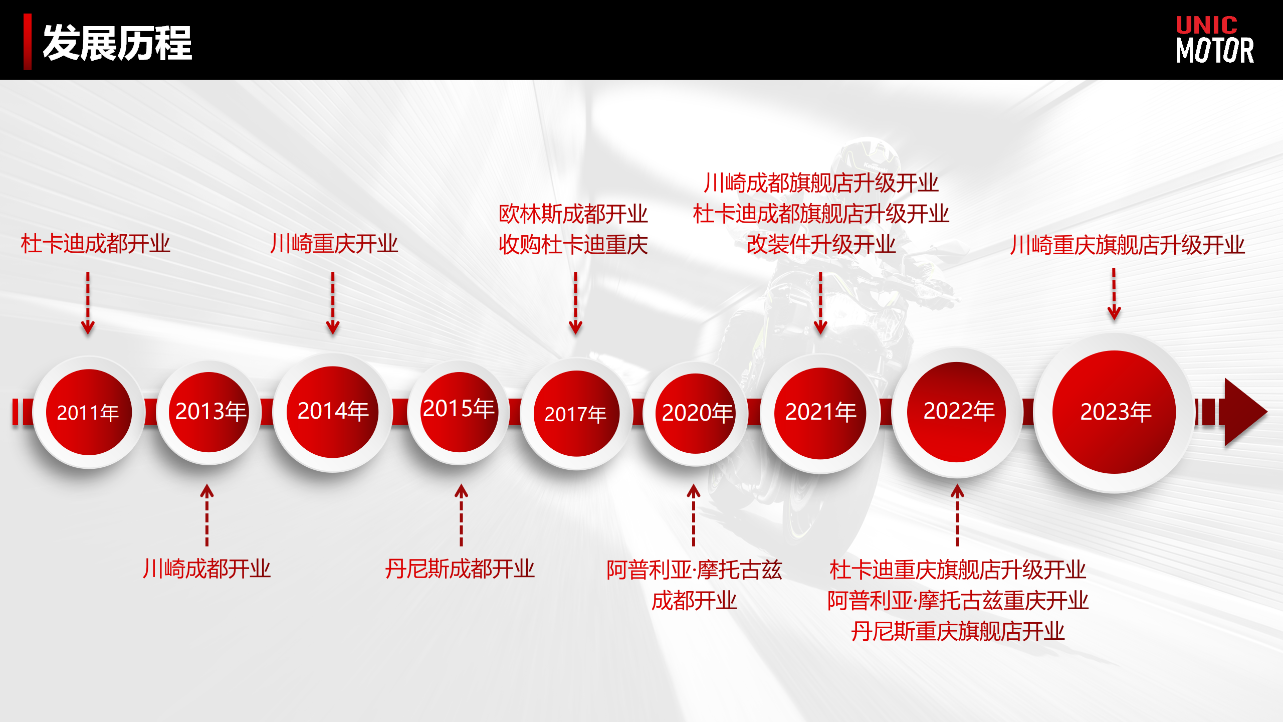 公司成立于2011年,经过12年的发展.现公司旗下有川崎成都旗舰店,杜卡迪成都旗舰店,改装件,A星成都旗舰店位于青羊区蓉西阳光,阿普利亚古兹成都,丹尼斯成都位于武侯区广福桥巷.川崎重庆旗舰店,杜卡迪重庆旗舰店,阿普利亚古兹重庆店,丹尼斯重庆店位于重庆市南岸区海棠晓月. 公司以售前和售后“一条龙服务”的经营模式,业务范围覆盖整车销售、维修检测、服装销售、二手车交易、进口车辆精品及改装件、保险,全力以赴的致力于把摩托车运动文化带到成都乃至整个西南地区,发扬健康的摩托车运动精神,实现每一位骑士和摩托车爱好者体验大排量摩托的速度与激情的梦想。公司股东及高层团队均具有丰富的车辆销售服务经验,多年的经验使得公司在市场营销、售后服务、企业战略方面具有核心竞争力,从而凝聚成了一股企业发展前进的动力,确保决策准确超前。12年来公司拥有稳定的客户群体,受到广大客户的连连好评。
